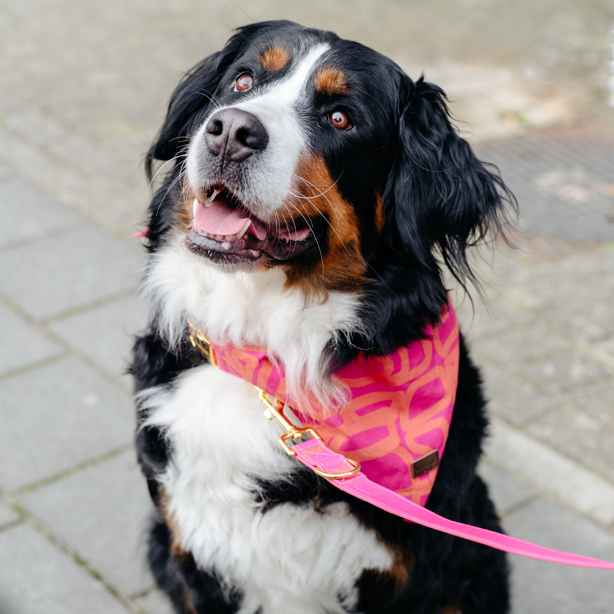 Verschönere die täglichen Spaziergänge Deines pelzigen Seelenverwandten mit dem 4-teiligen Leinen-Set Charleston von bo&flash., welches aus hochwertigem veganem Leder gefertigt ist. Dieses Set zeigt das lebhafte Chouk-Design aus der Graphic Groove Collection. Das verspielte grafische Muster in fröhlichen Pink- und Orangetönen macht Spaziergänge für Dich und Deinen freundlichen Vierbeiner zu lebendigen und unterhaltsamen Abenteuern