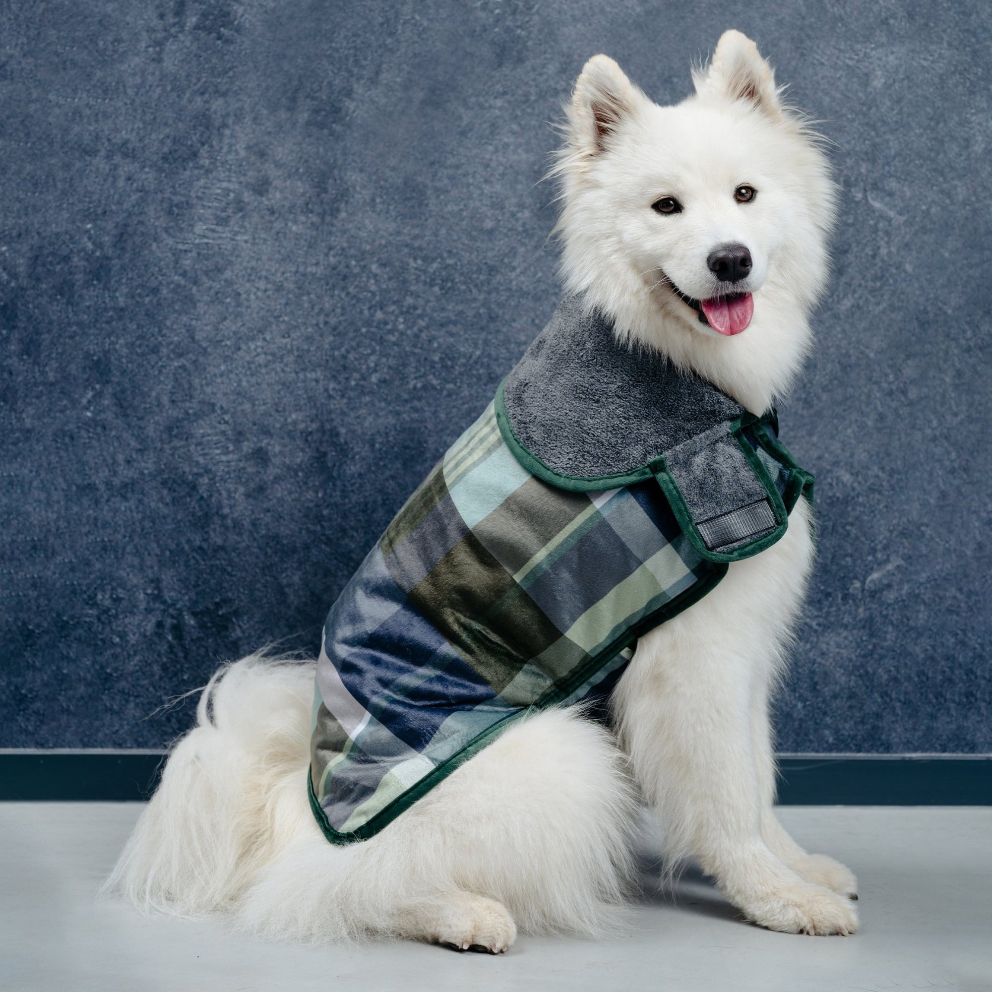 Verschönere das Badeerlebnis Deines pelzigen Seelenverwandten mit dem bo&flash. Hundebademantel Ashville. Der Frank-Print aus der Forest Fusion Collection kommt in einem ruhigen Karomuster in beruhigenden Blau-, Grün- und Grautönen daher. Dieser kuschelige Bademantel verleiht Deinem Wuffi nach dem Bad einen Hauch von Ruhe und Stil und ist somit das perfekte Verwöhnprogramm für Deinen treuen Begleiter. Erweitere Deine Haustierpflegeroutine mit unserem Bademantel für Hunde und biete Deinem geliebten Vierbeiner ein beruhigendes und stilvolles Spa-Erlebnis.