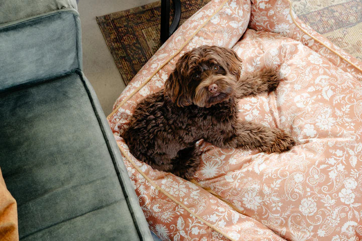 Schaffe einen ruhigen Rückzugsort für Deinen pelzigen Seelenverwandten mit dem bo&flash. Austin Hundebett im Design Emmelie aus der Ethnic Euphoria Collection. Der wunderschöne weiße Blumendruck von Emmelie auf einem beruhigenden braun-orangenen Hintergrund passt einfach zu jedem Einrichtungsstil, von Bohème über Rustikal bis Romantisch. Mit seiner Vielseitigkeit und seinem Komfort ist dieses Bett die perfekte Wahl, um Deinem treuen Begleiter einen friedlichen Rückzugsort zu bieten.