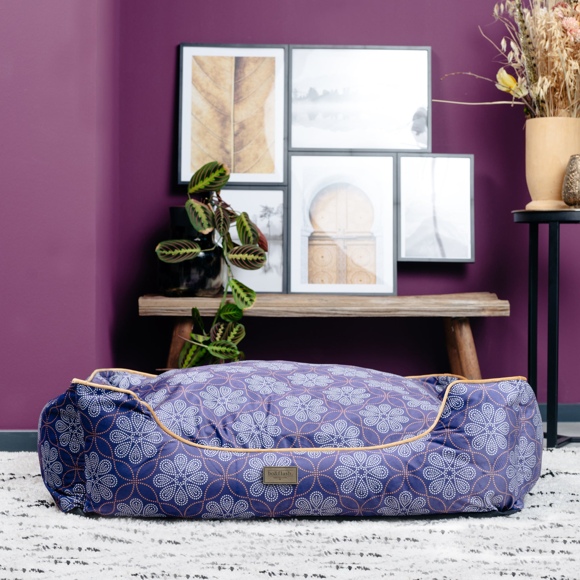 Verwöhne deinen vierbeinigen Freund mit dem bo&flash. Austin Hundebett im heite.ren Matthias-Design aus der Ethnic Euphoria Collection. Die tiefblaue Farbe, verziert mit einem schlichten, gepunkteten Blumenmuster, strahlt wohltuende Ruhe aus. Die subtilen orangefarbenen Akzente, die an Blüten erinnern, verleihen dem Hundebett einen Hauch Blumenmeer-Charakter. Dieses Möbelstück passt zu vielen Einrichtungsstilen und ist der ideale Rückzugsort für Deinen geliebten Hund