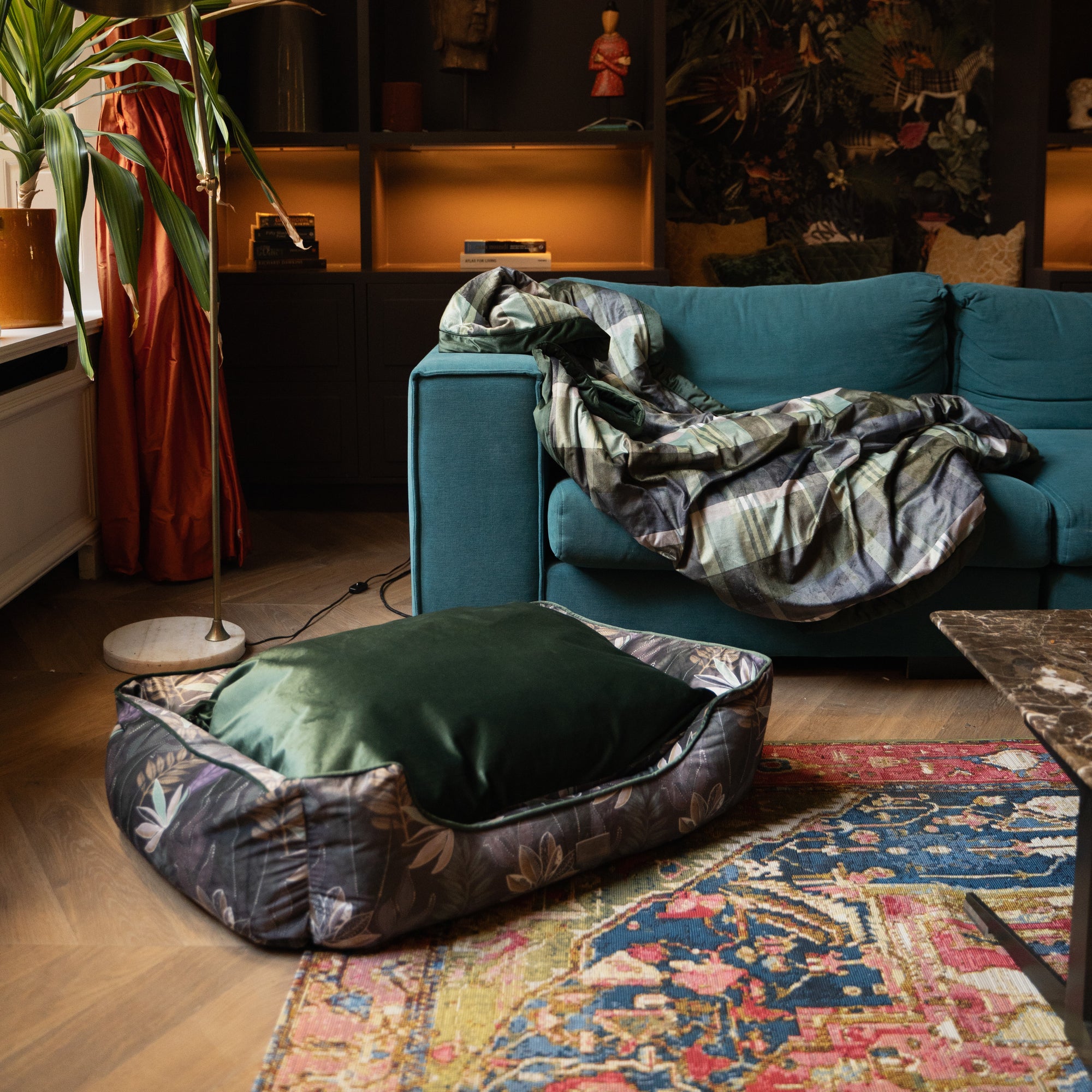 Biete Deinem geliebten Vierbeiner den ultimativen Komfort mit dem bo&flash. Austin Hundebett mit dem botanischen Max-Design aus der Forest Fusion Collection. Mit seinen wunderschönen Grüntönen, die durch Gelb-, Violett- und Brauntöne ergänzt werden, zeigt Max verschlungene Blattmuster und schafft eine Oase für deinen geliebten Vierbeiner. Dieses Hundebett ist ideal für ruhige und botanisch inspirierte Wohnräume und bietet den perfekten Rückzugsort für Deinen pelzigen Seelenverwandten.