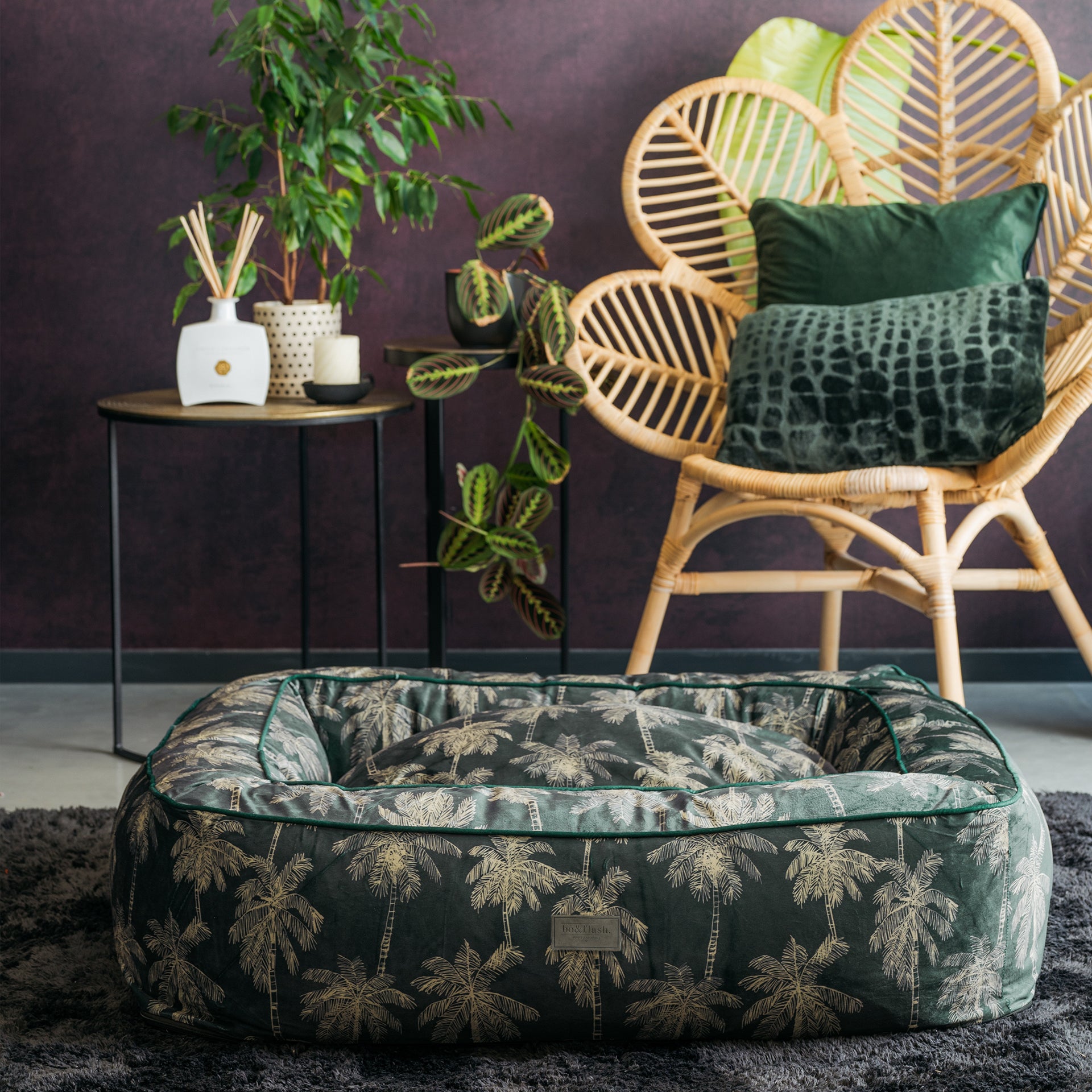 Das bo&flash. Boise Hundebett im Design Romy aus der Forest Fusion Collection ist eine stilvolle Ergänzung für Dein Zuhause. Dieses elegante Hundebett in einem in Grün und Gold gehaltenen botanischen Druck, schafft ein perfektes Design für alle Dschungel-Liebhaber. Die Mischung aus farbenfrohen Blättern verleiht jedem Interieur einen Hauch von natürlicher Schönheit und macht dieses Bett zu einem unverzichtbaren Accessoire für Deinen urbanen Dschungel. Verbessere den Komfort Deines pelzigen Seelenverwandten und Deines Interieurs mit diesem Hundebett.