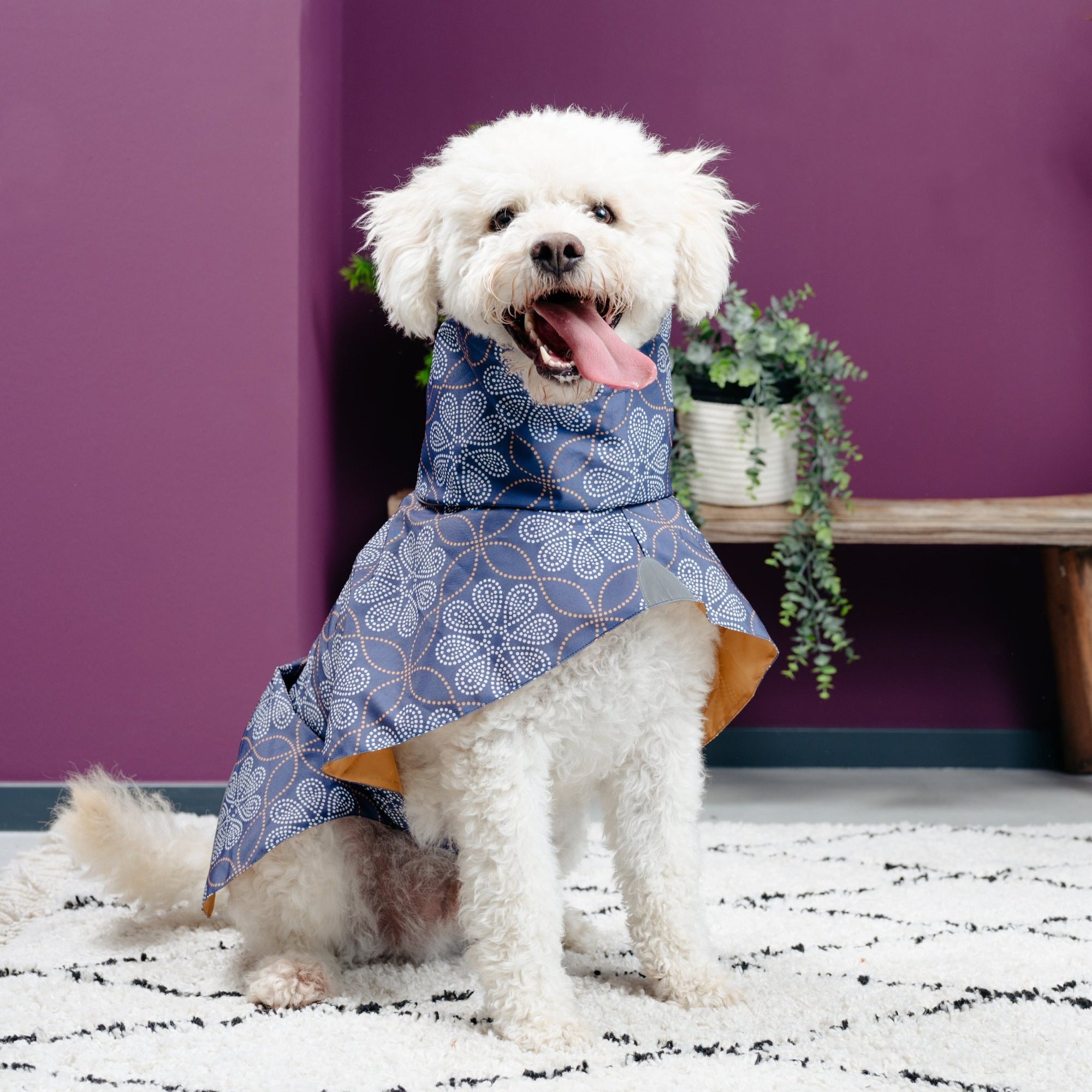 Discover the bo&flash Minneapolis Dog Raincoat featuring the trendy Matthias floral design from our Ethnic Euphoria collection. Adorned with cheerful orange flower-shaped dots against a beautiful blue background, this raincoat is the perfect choice for your furry soulmate. Keep them stylish and dry in this eye-catching raincoat!