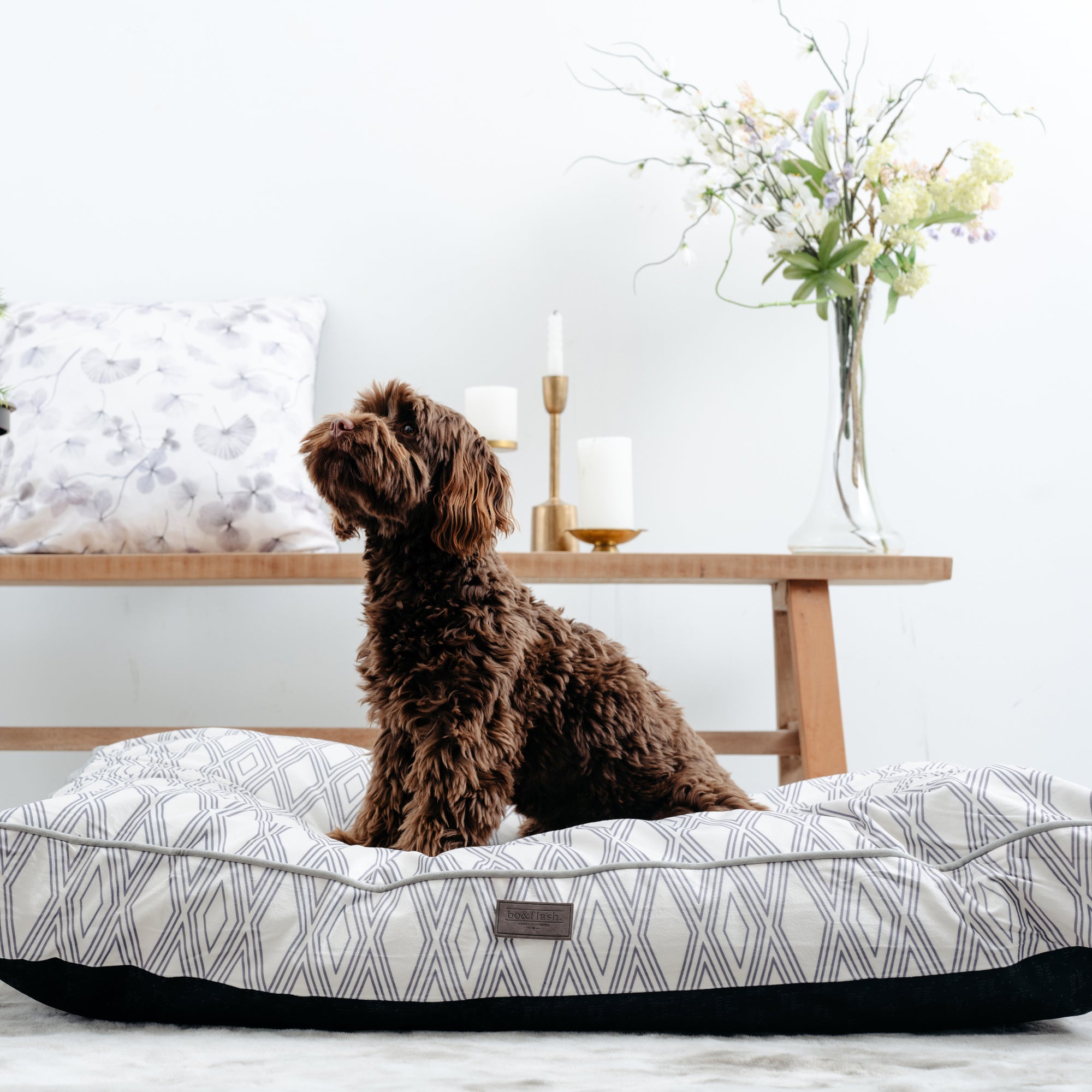 The dog pillow Madison by bo&flash in the Ruby design from the Japandi Serenity collection is more than just a pet accessory. With its calm grey graphic print with an elegant diamond pattern, this dog mat will genuinely enhance your interior while providing a cozy spot for your furry soulmate to relax in comfort.