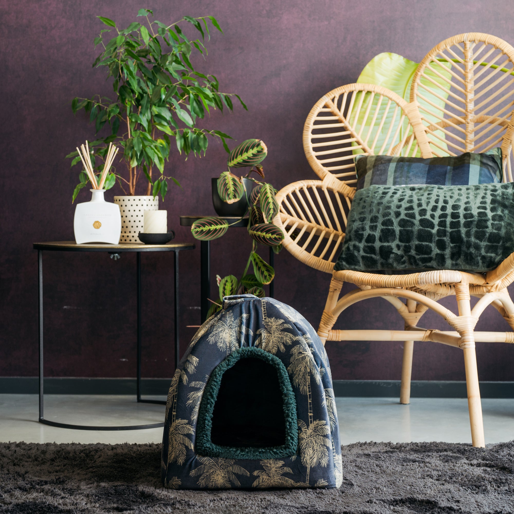Introducing the bo&flash New York cat house, featuring the botanical Romy design from the Forest Fusion collection. This jungle-inspired oasis is adorned in a lush green color and vibrant yellow palm trees, providing your furry soulmate with a tropical paradise right at home. Elevate both your cat's comfort and your interior's style with this fashionable cat house, perfectly suited for a bohemian and vintage-inspired setting.