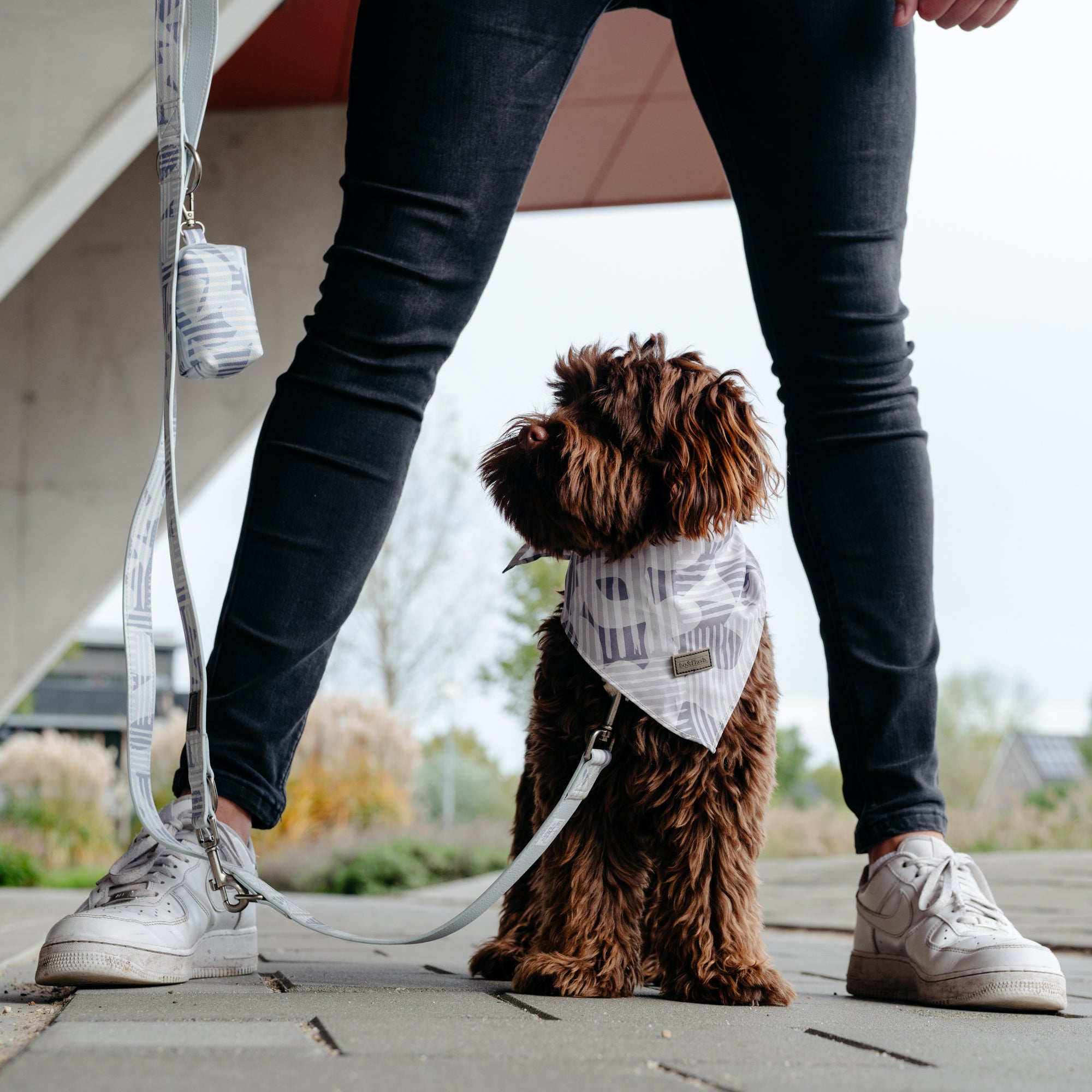 Das Set umfasst vier perfekt aufeinander abgestimmte Teile: ein Halsband, eine passende Leine, ein stylisches Halstuch und eine praktische Kotbeuteltasche – alles im eleganten bo&flash Look.
